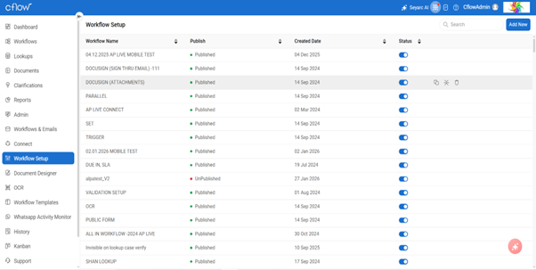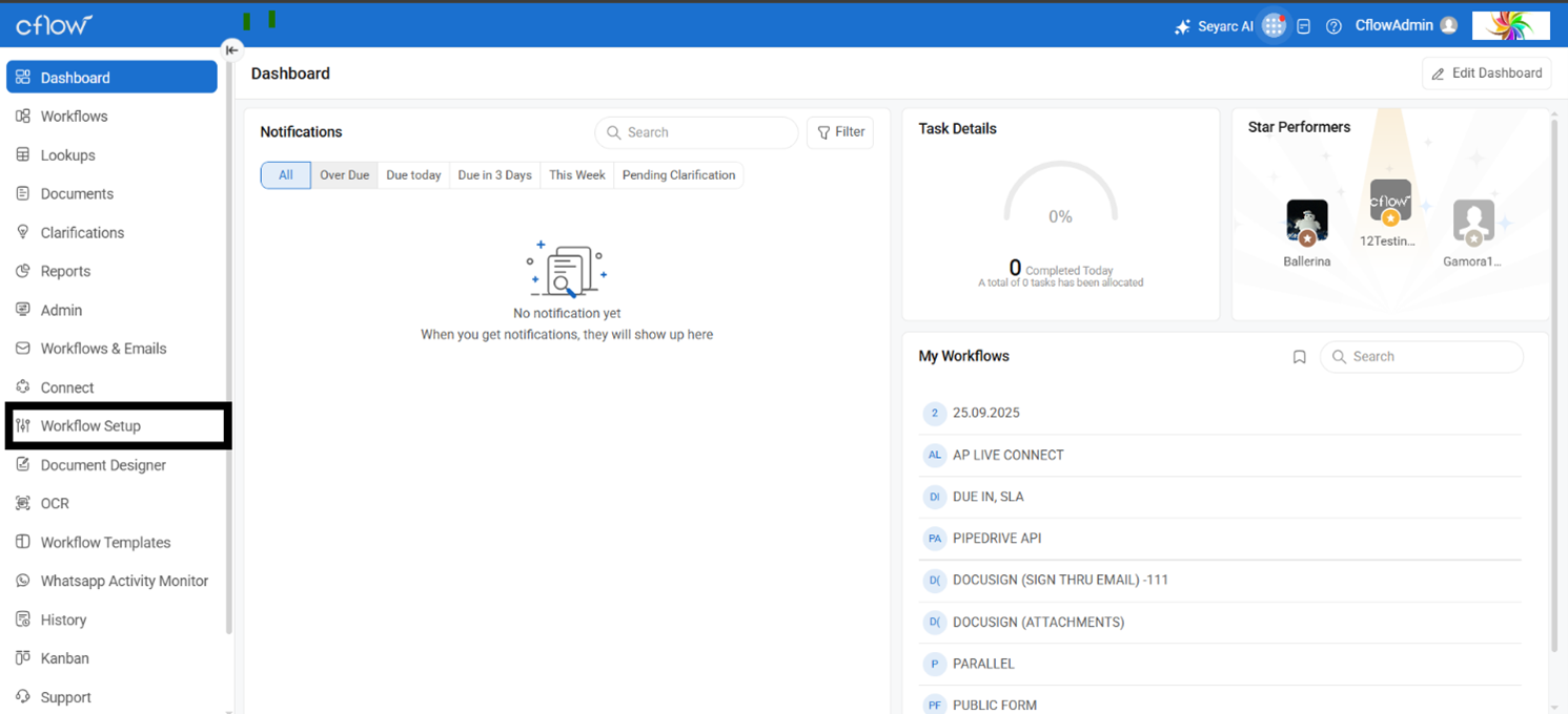 Access the application dashboard and navigate to Workflow Setup.