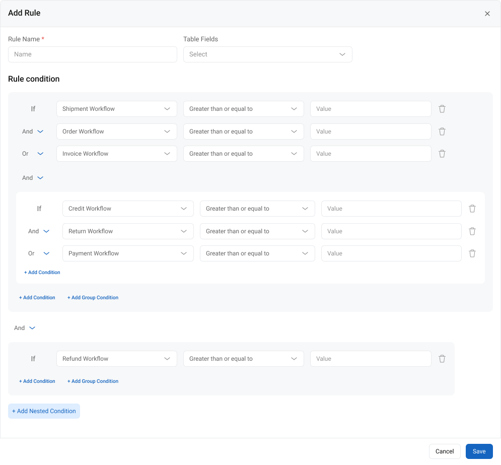 The Rules engine now supports nested condition groups, allowing you to build structured, multi-level logical expressions directly in the rule designer. This enhancement enables the creation of advanced rule logic without relying on workaround configurations or multiple intermediary rules.