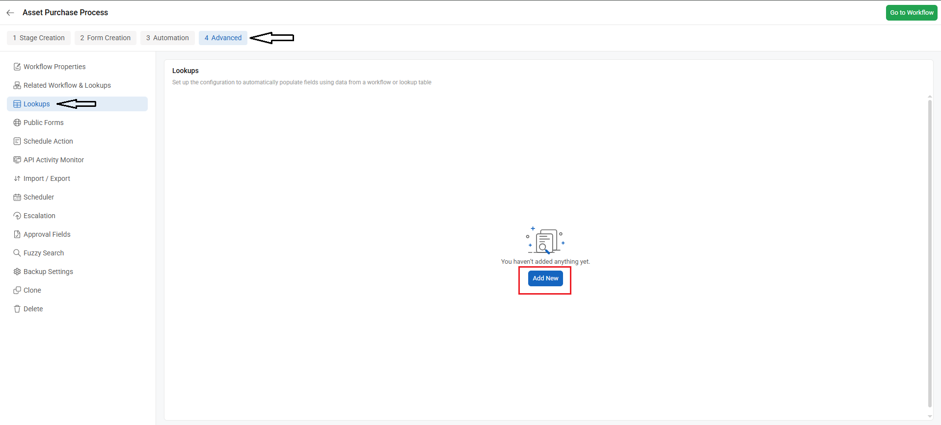 – Go to Workflow Setup, select a workflow, click the Advanced tab, and then open the Lookups menu to configure a lookup condition.