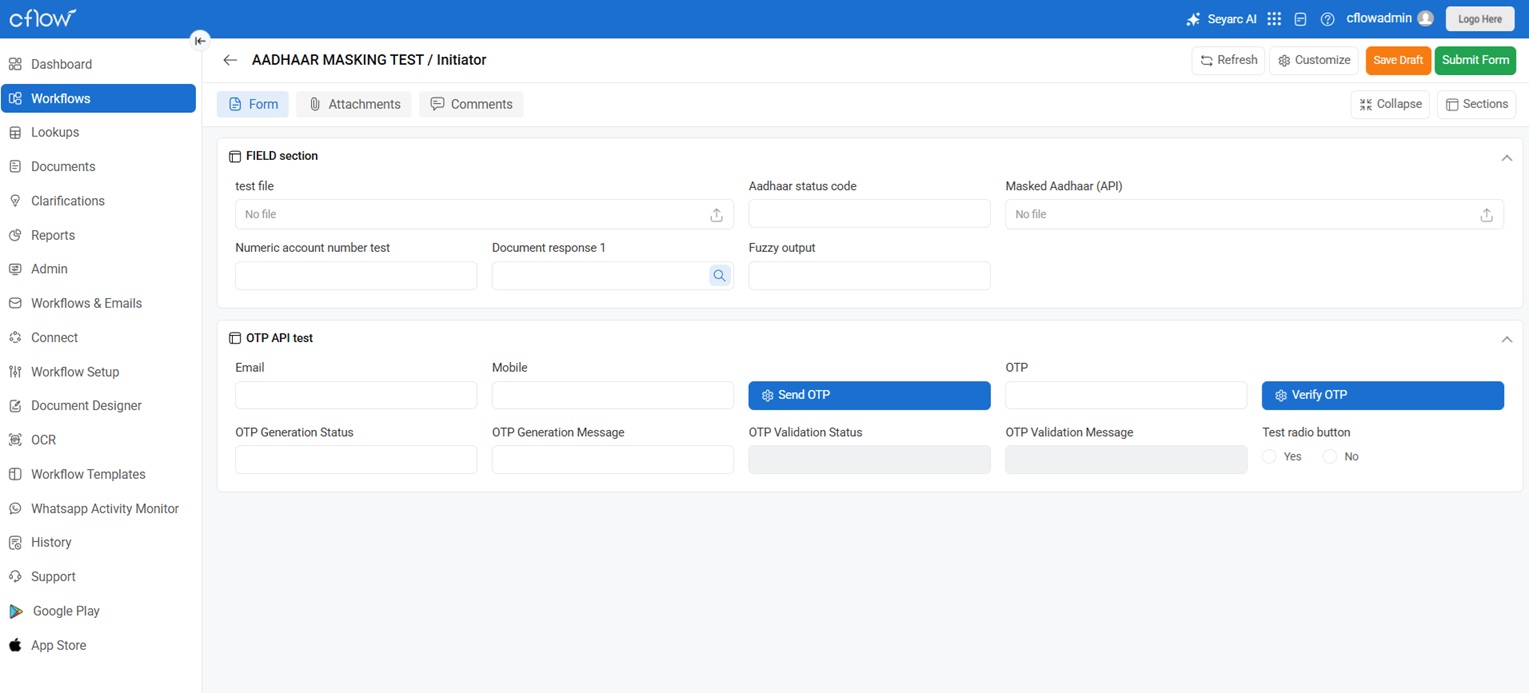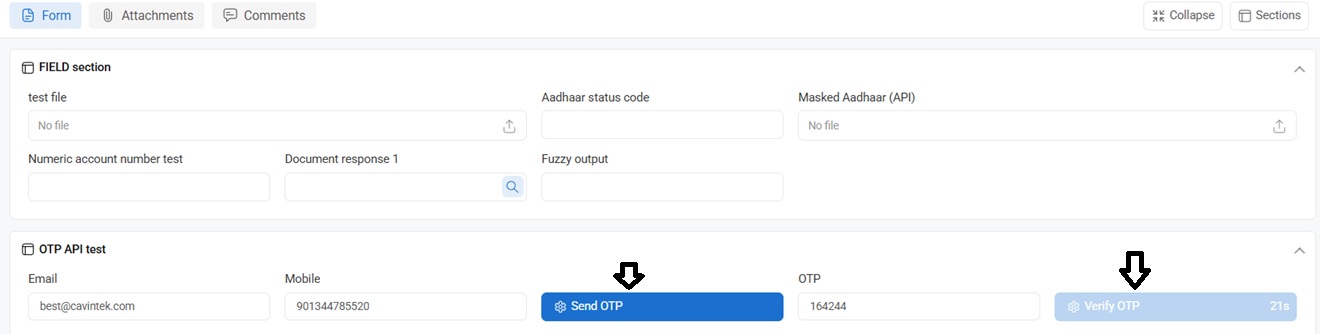 The “Invoke API OTP sending button” in Cflow refers to an user feature that triggers REST API calls to initiate OTP (one-time password) delivery for the verification. Its scope enables triggering OTP sends via API and verifying the OTP which has been generated.