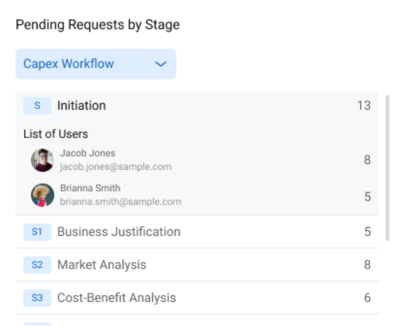 - The expanded view displays users with pending requests in that stage