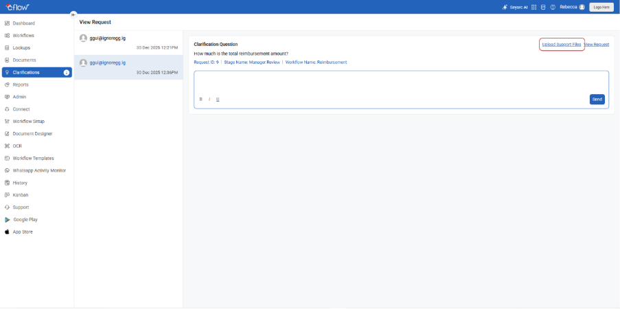 The Upload Support Files feature allows users to attach documents or files when responding to clarification requests. This ensures clear communication and helps resolve clarifications more efficiently.